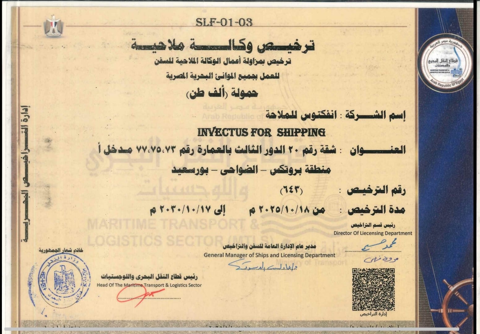 Invectus Shipping holds certifications and approvals from international maritime authorities, reflecting our commitment to quality, safety, and regulatory compliance. These certifications guarantee that all marine supplies Egypt and vessel support services meet global standards